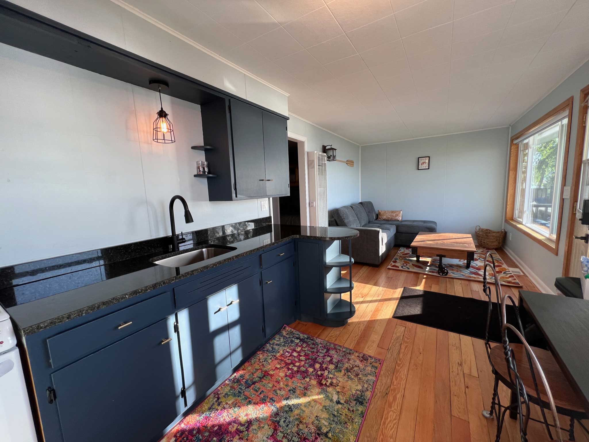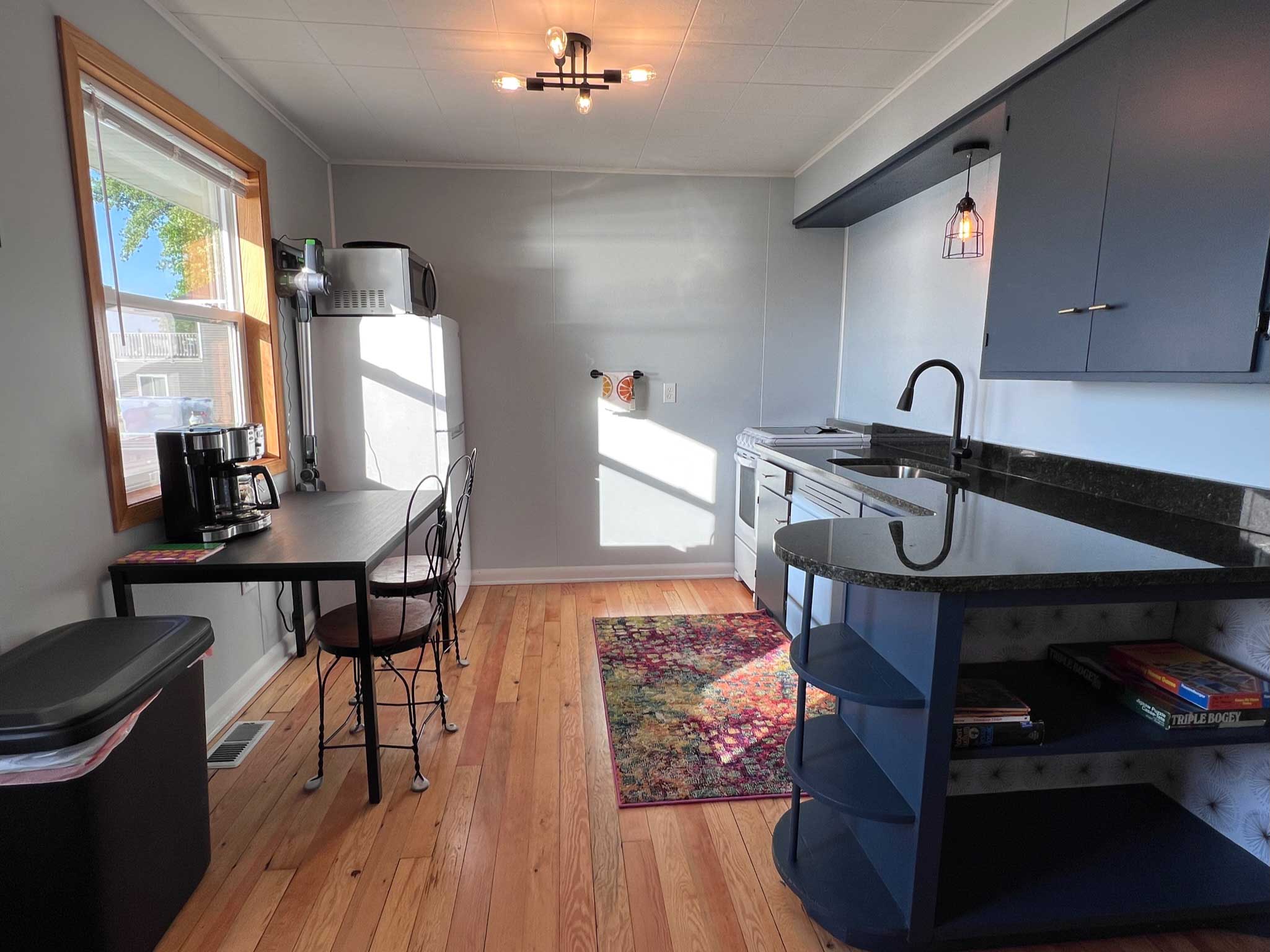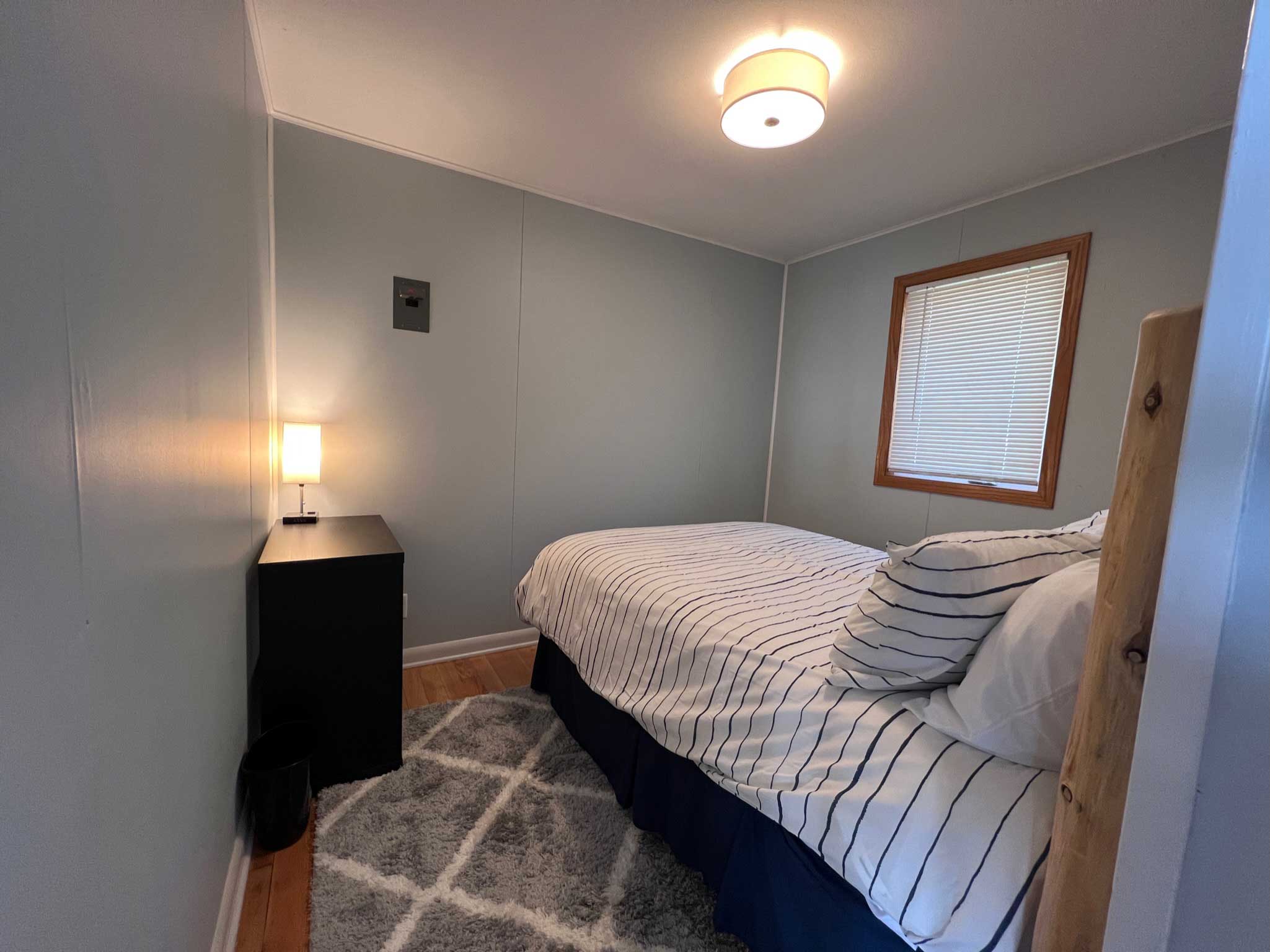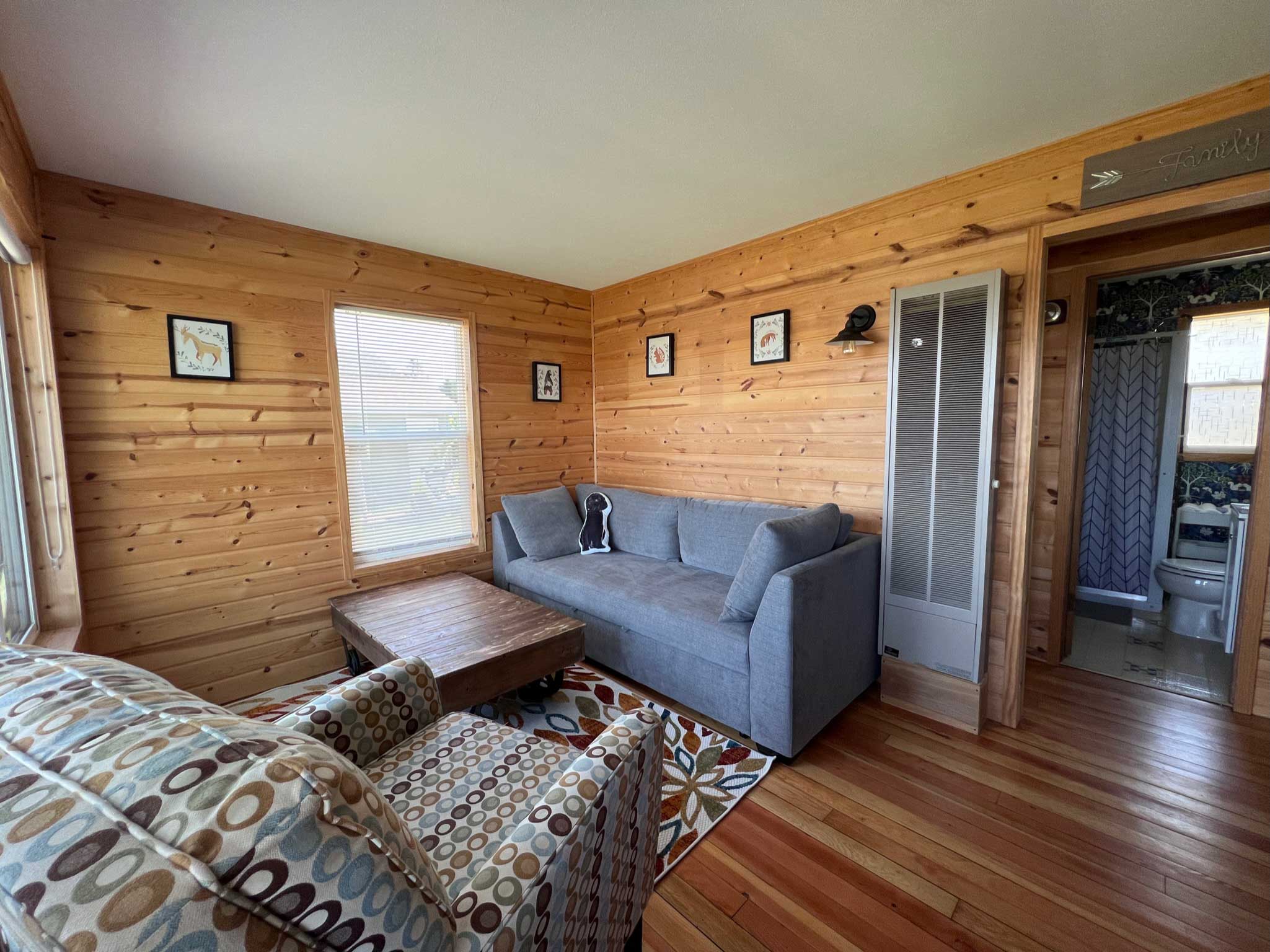 Oland Villa, named after a small island and province just off the southeast coast of Sweden, is a two-bedroom, one-bath, dog-friendly unit offering a single full bed in one room and twin bunks in the other. The living room has a pullout sofa for additional sleeping space.