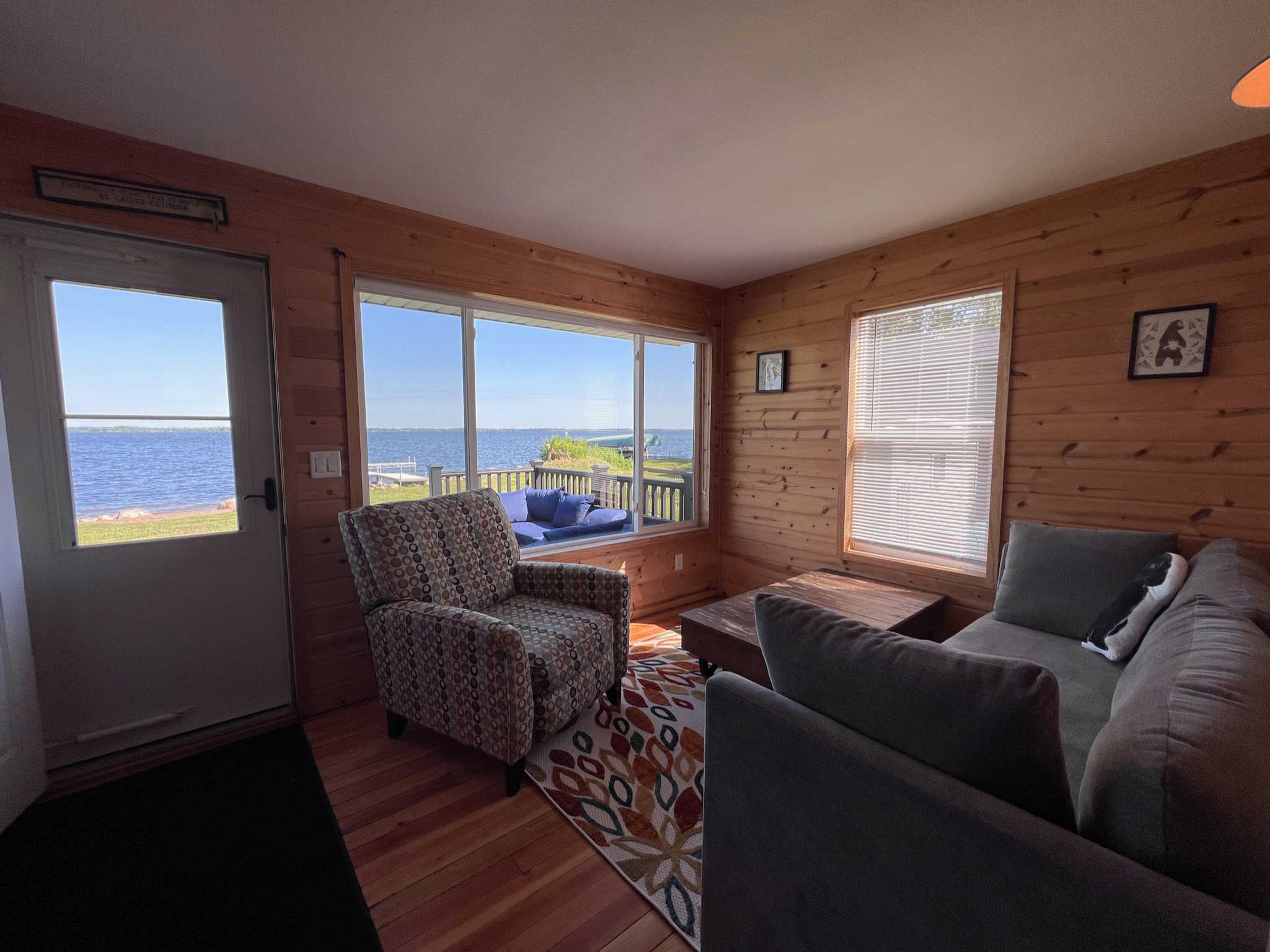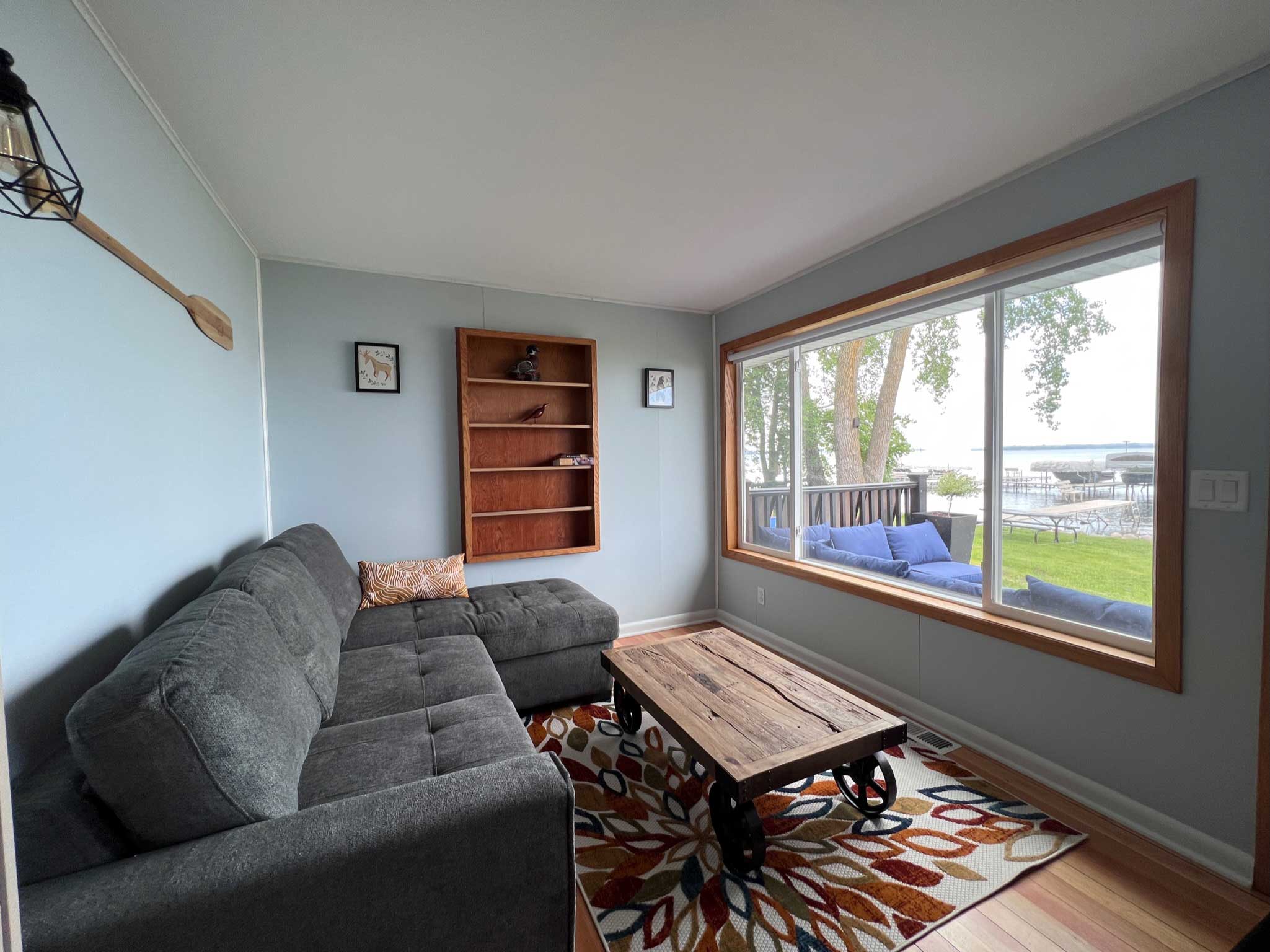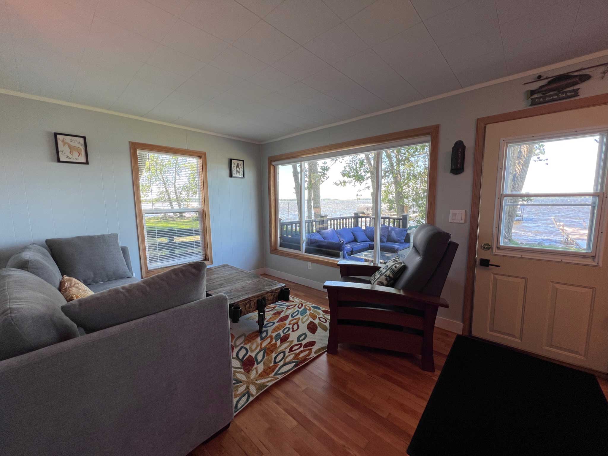 The living room has a pullout sofa for additional sleeping space. Kitchens are fully stocked with basic cooking essentials and panoramic views of Lake Osakis.