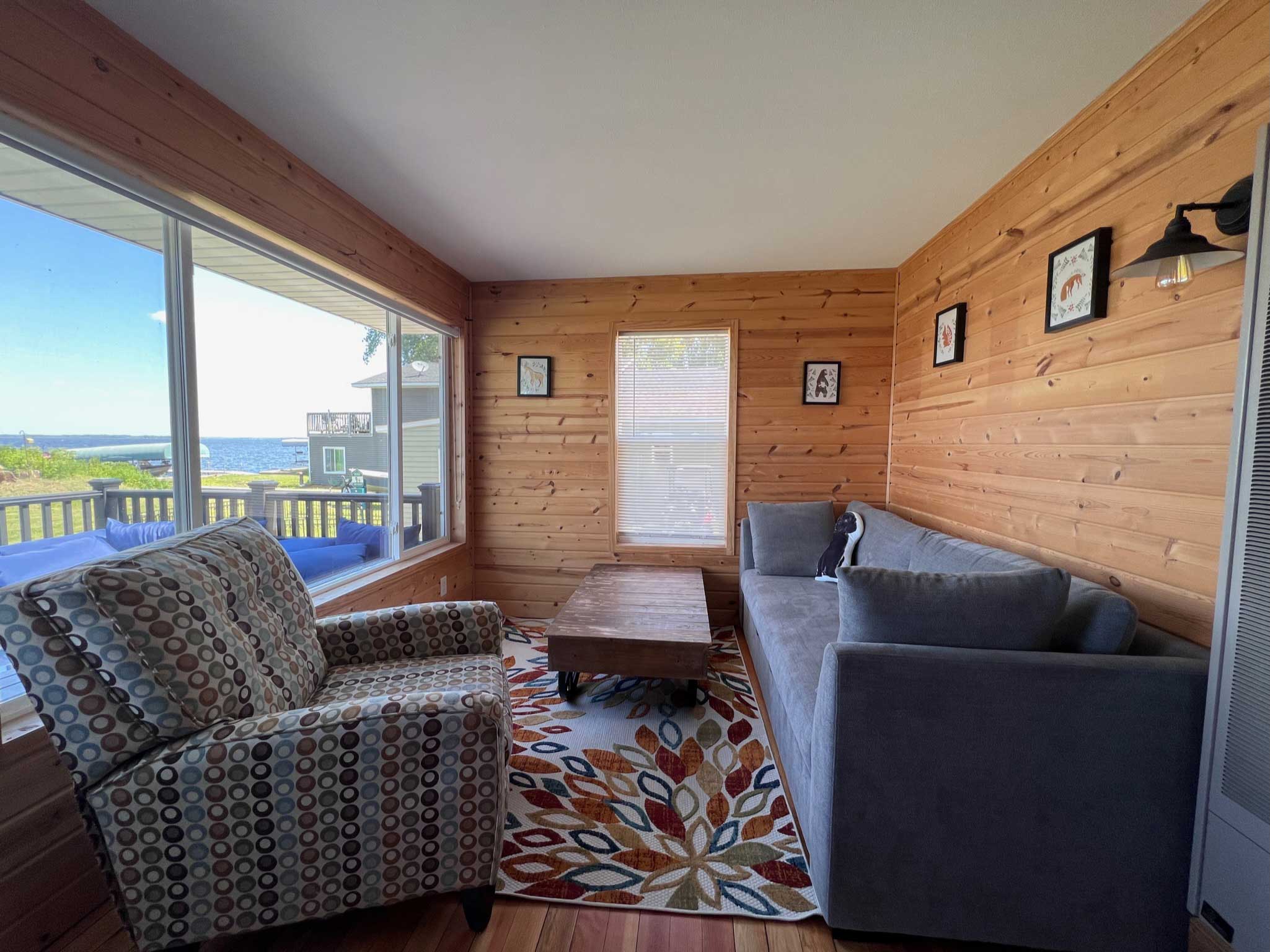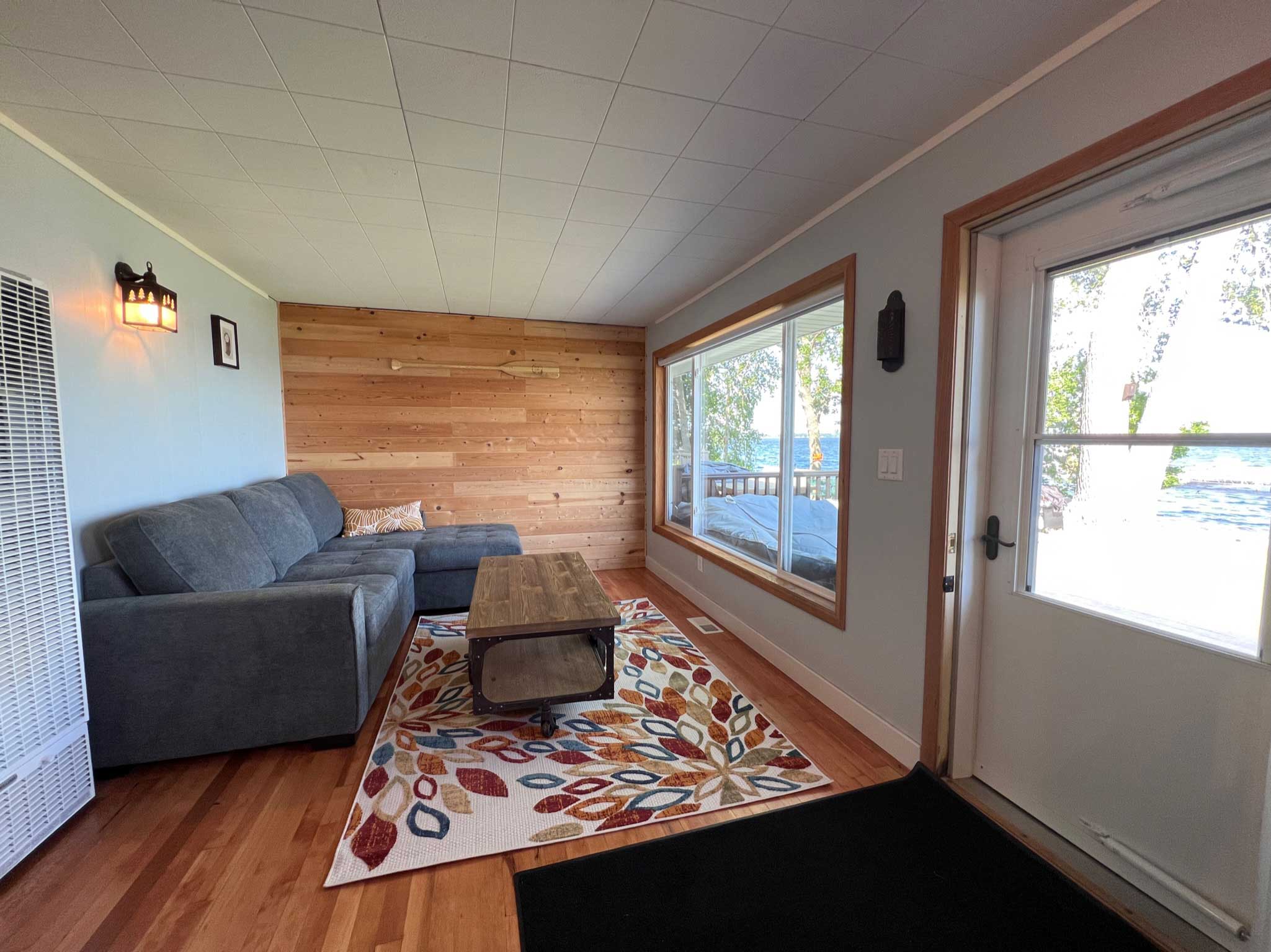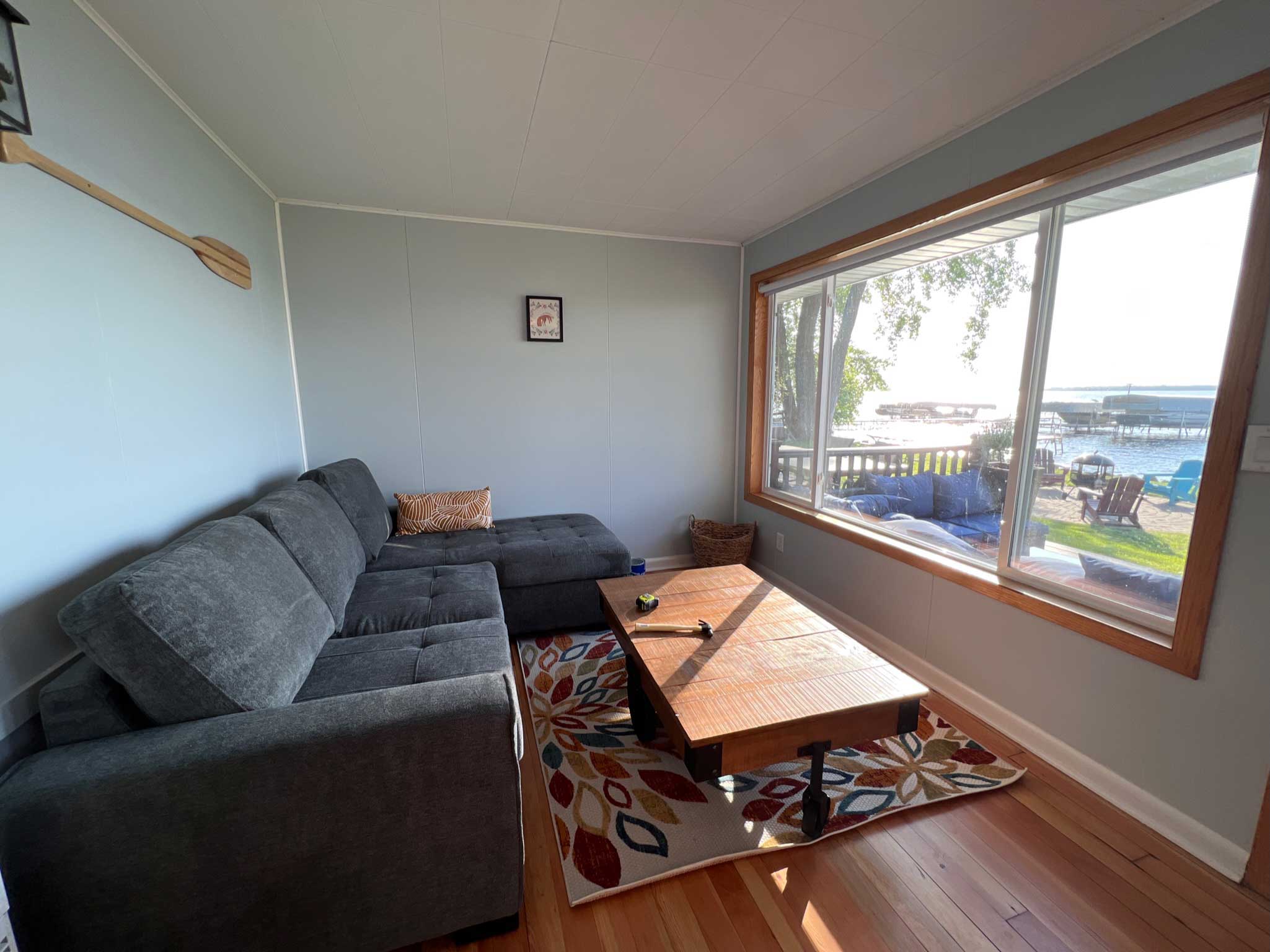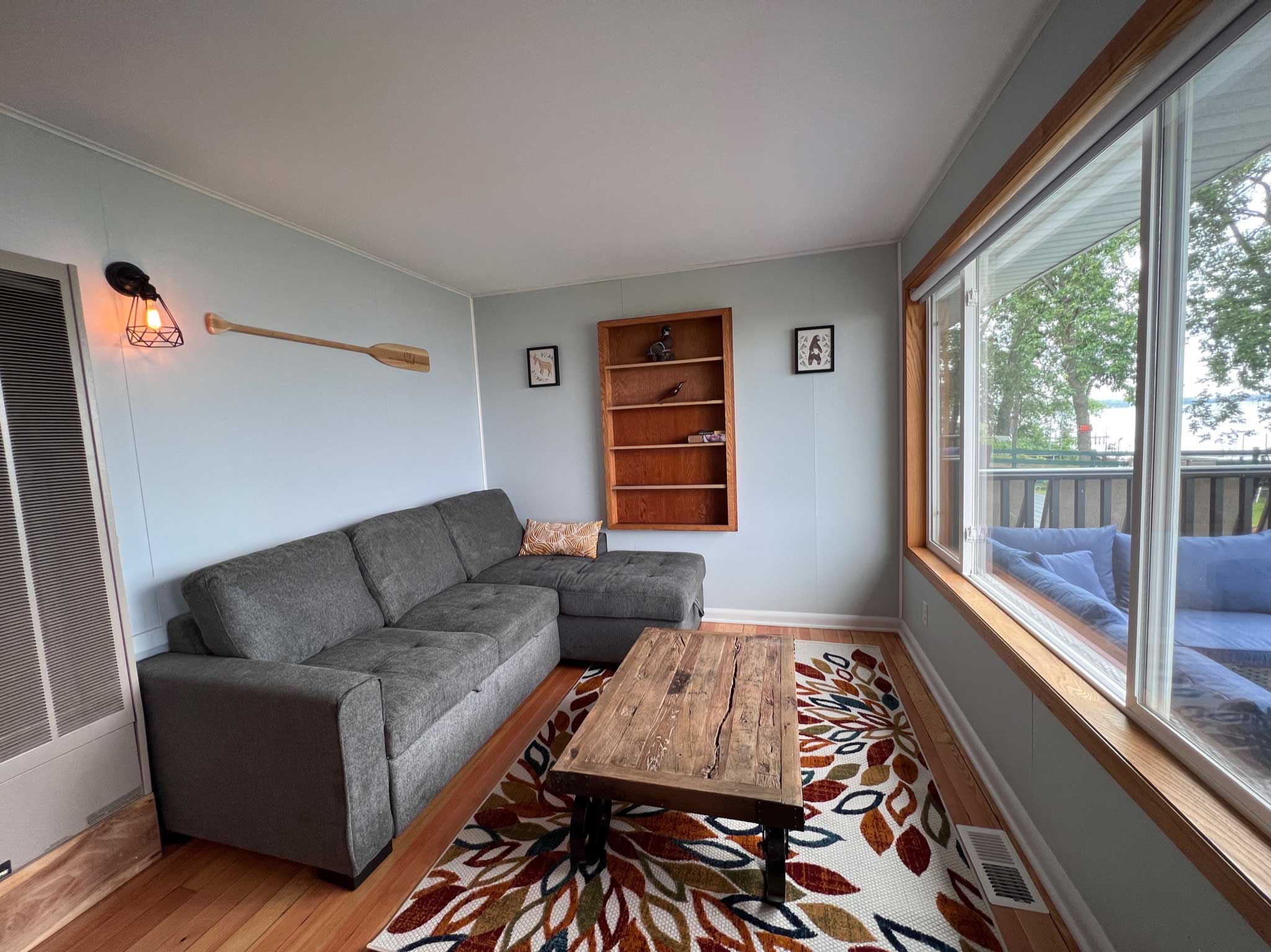 The living room has a pullout sofa for additional sleeping space. Kitchens are fully stocked with basic cooking essentials and panoramic views of Lake Osakis.